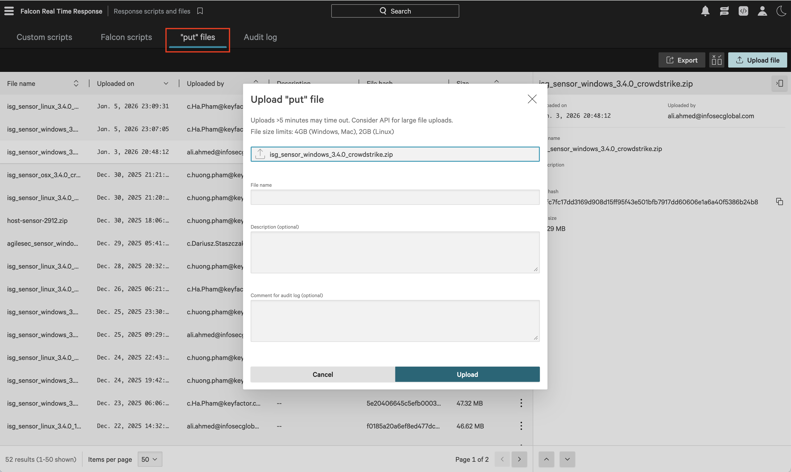 isg_sensor_<platform>_3.4.0_crowdstrike.zip, then click UploadFor Linux: