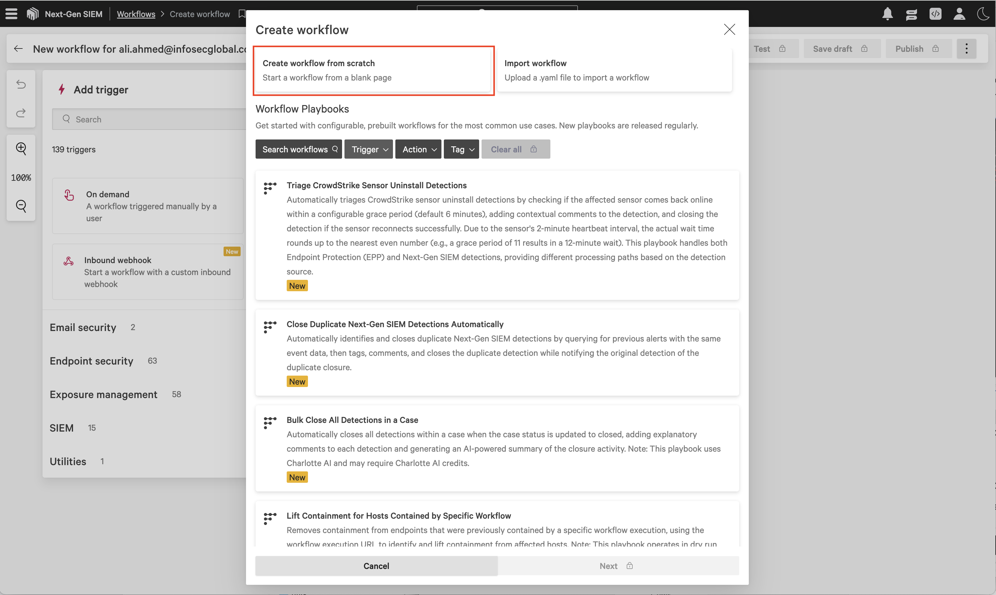 Navigate to Fusion SOAR -> Workflows, then click Create workflow to open then CrowdStrike workflow builder interface.