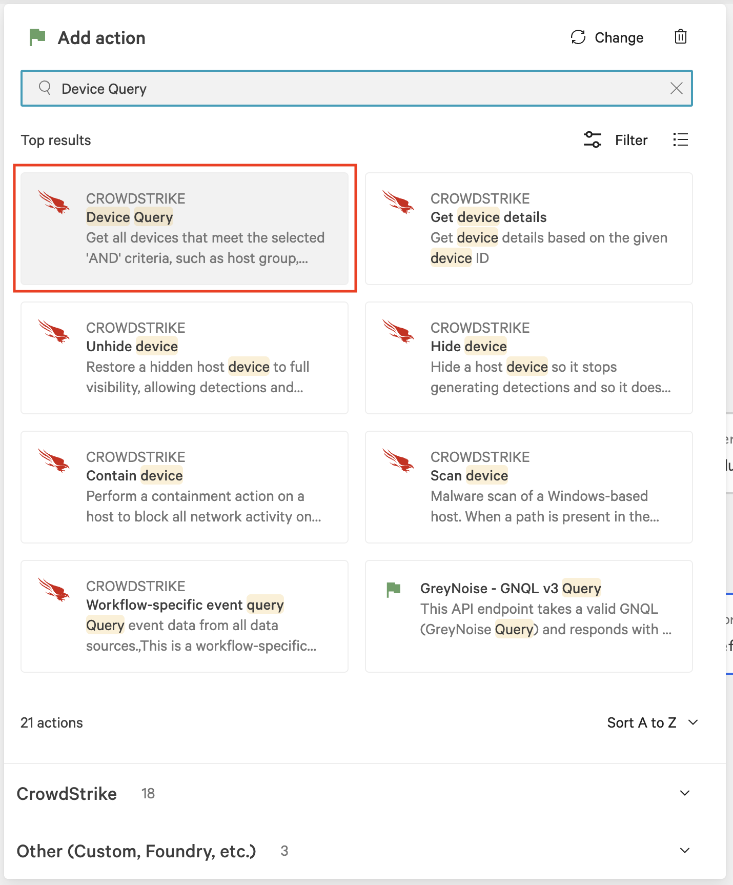 In the Add action dialog, search for and select Device Query.