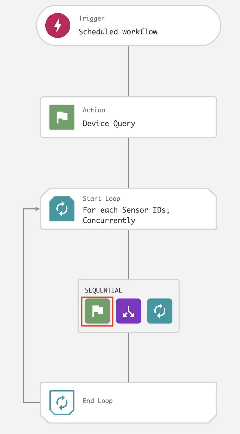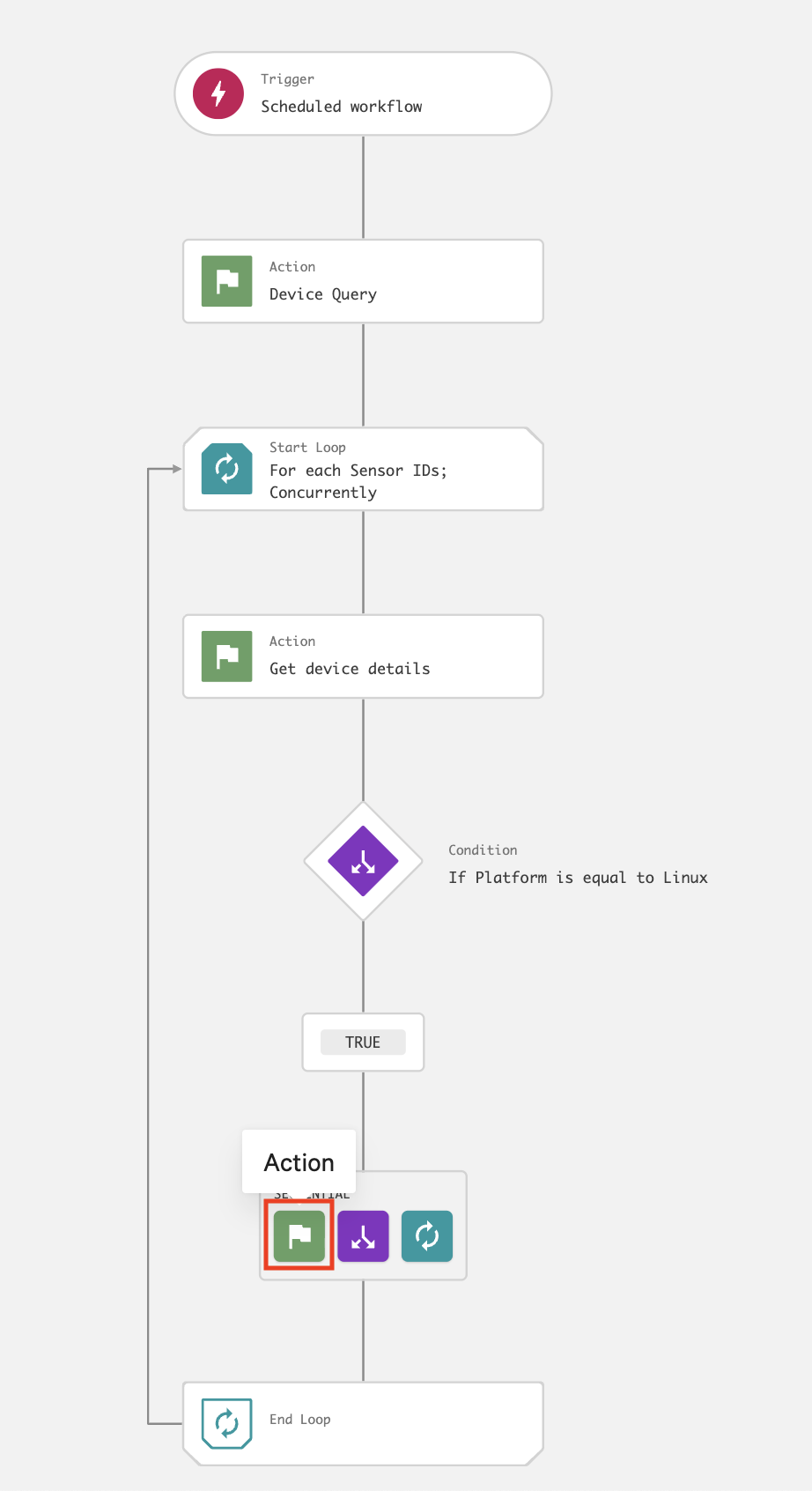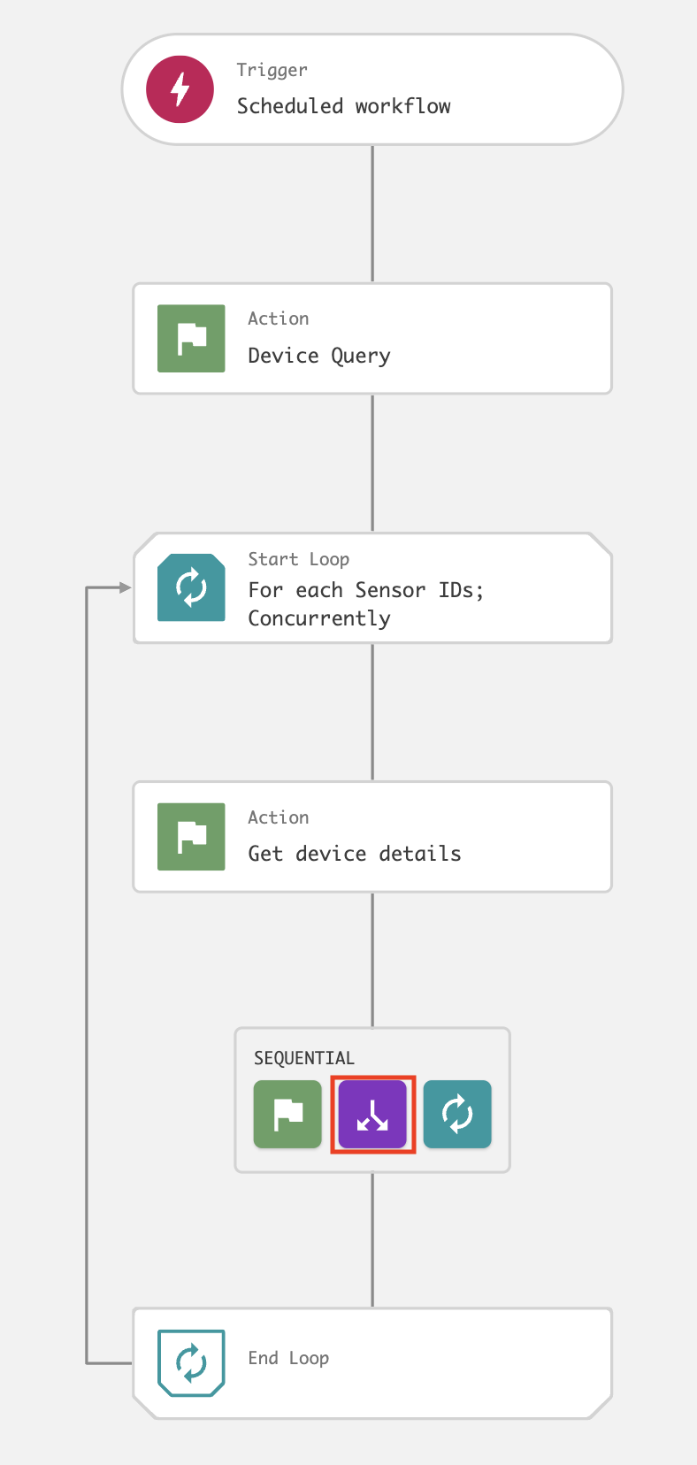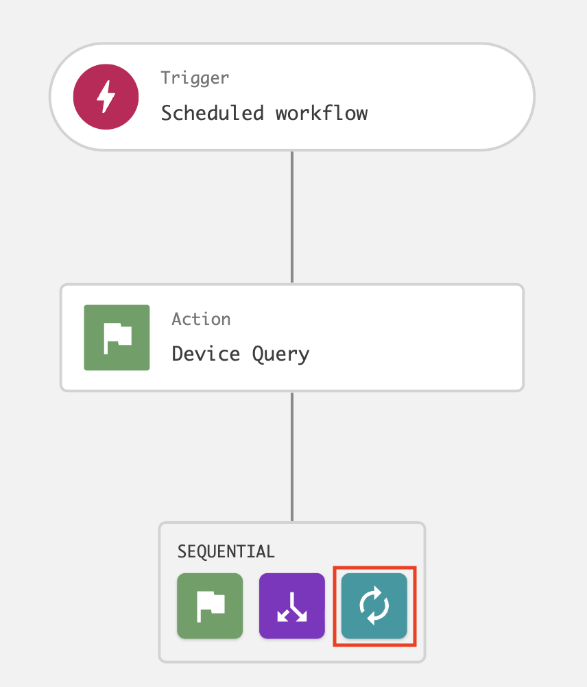 On the workflow builder, add a Loop after Device query.