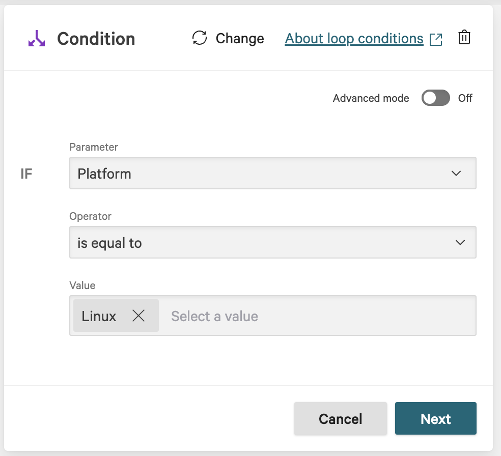 In the Condition dialog, enter the following and click Next: