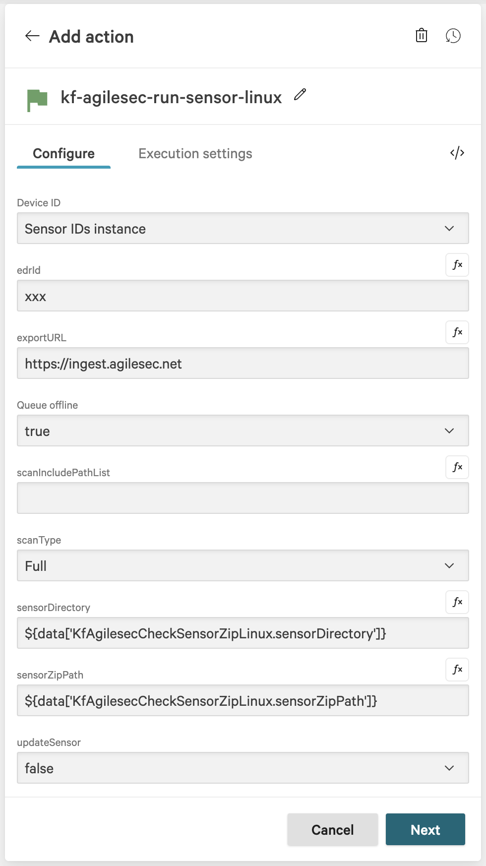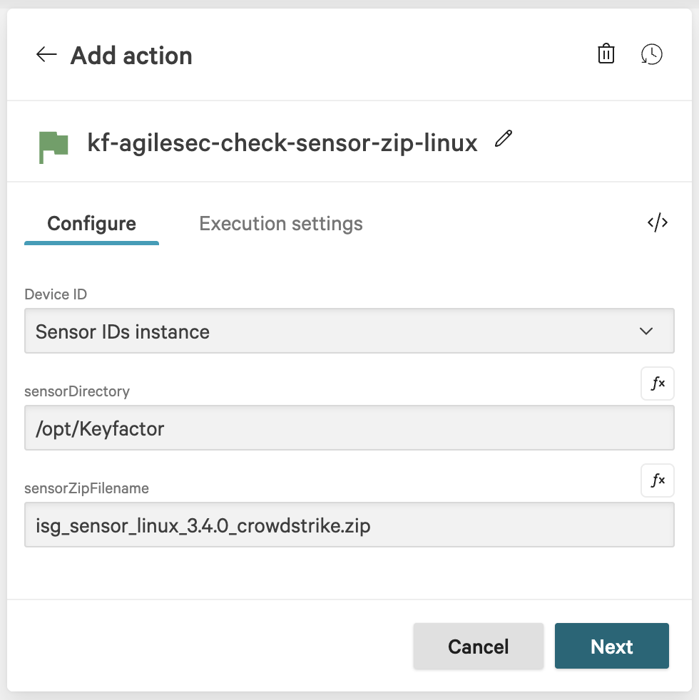 kf-agilesec-check-sensor-zip-linux.In the action configuration for kf-agilesec-check-sensor-zip-windows, enter the following recommended values and click Next: