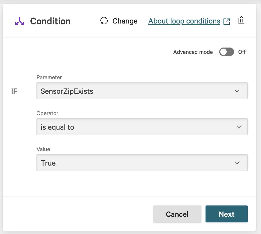 On the workflow builder, add a Condition after action kf-agilesec-check-sensor-zip-linux.