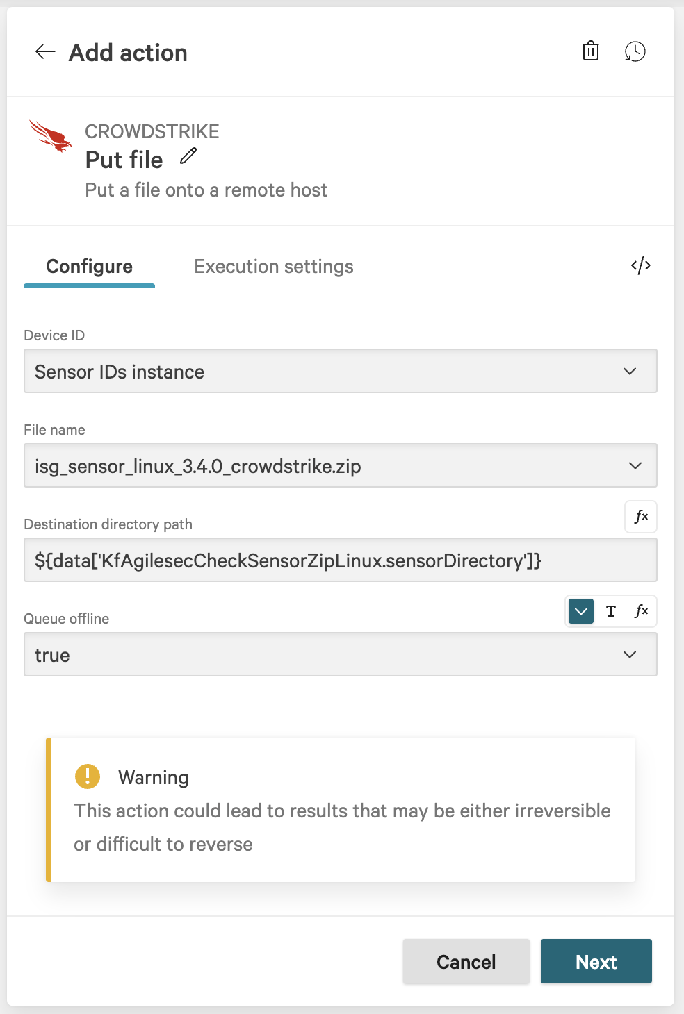 kf-agilesec-run-sensor-<platform>(same as Step 18) under the Put file.Configure the action