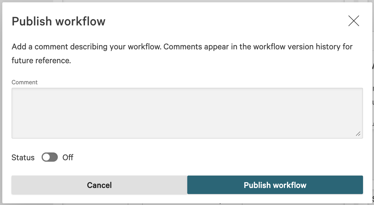 Click Publish, then in the Publish workflow dialog click Publish workflow. Toggle Status to on now or later to activate the workflow.