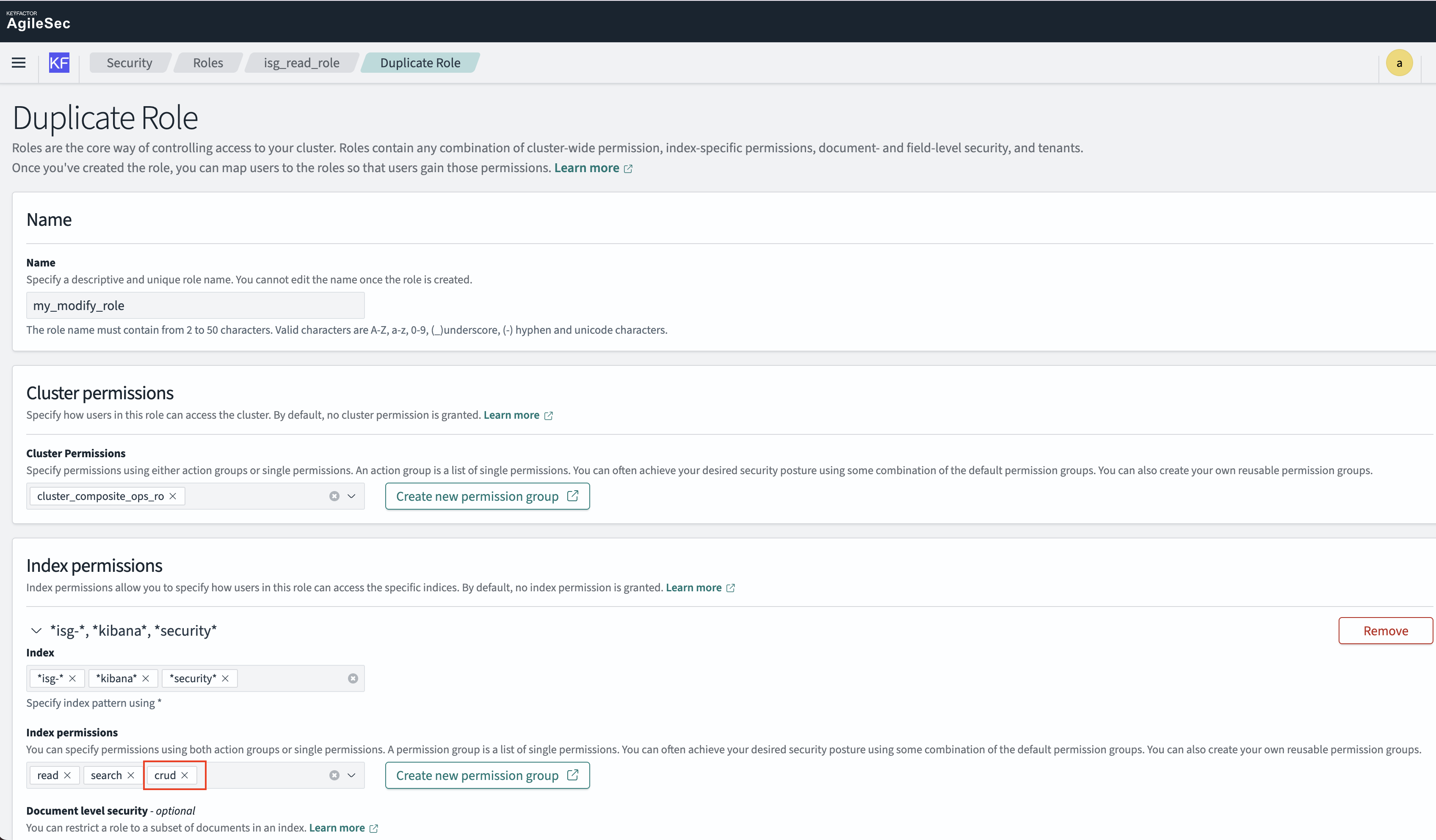 isg-*,*kibana*,*security*(no change)Index permissions: Add
