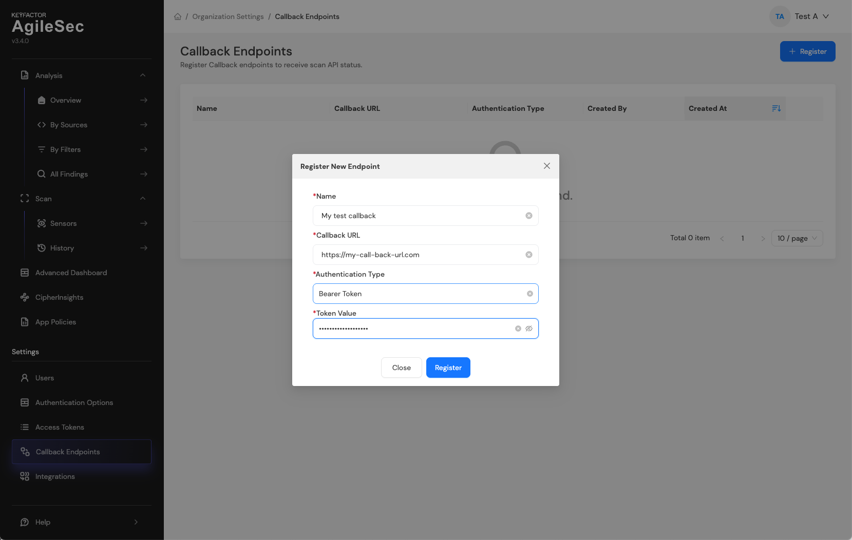 To receive scan status updates for API-initiated scans, you must register one or more callback endpoints. Registering callback endpoints lets you reference a pre-approved endpoint by Callback ID, so you don’t need to send sensitive callback credentials with each scan request.