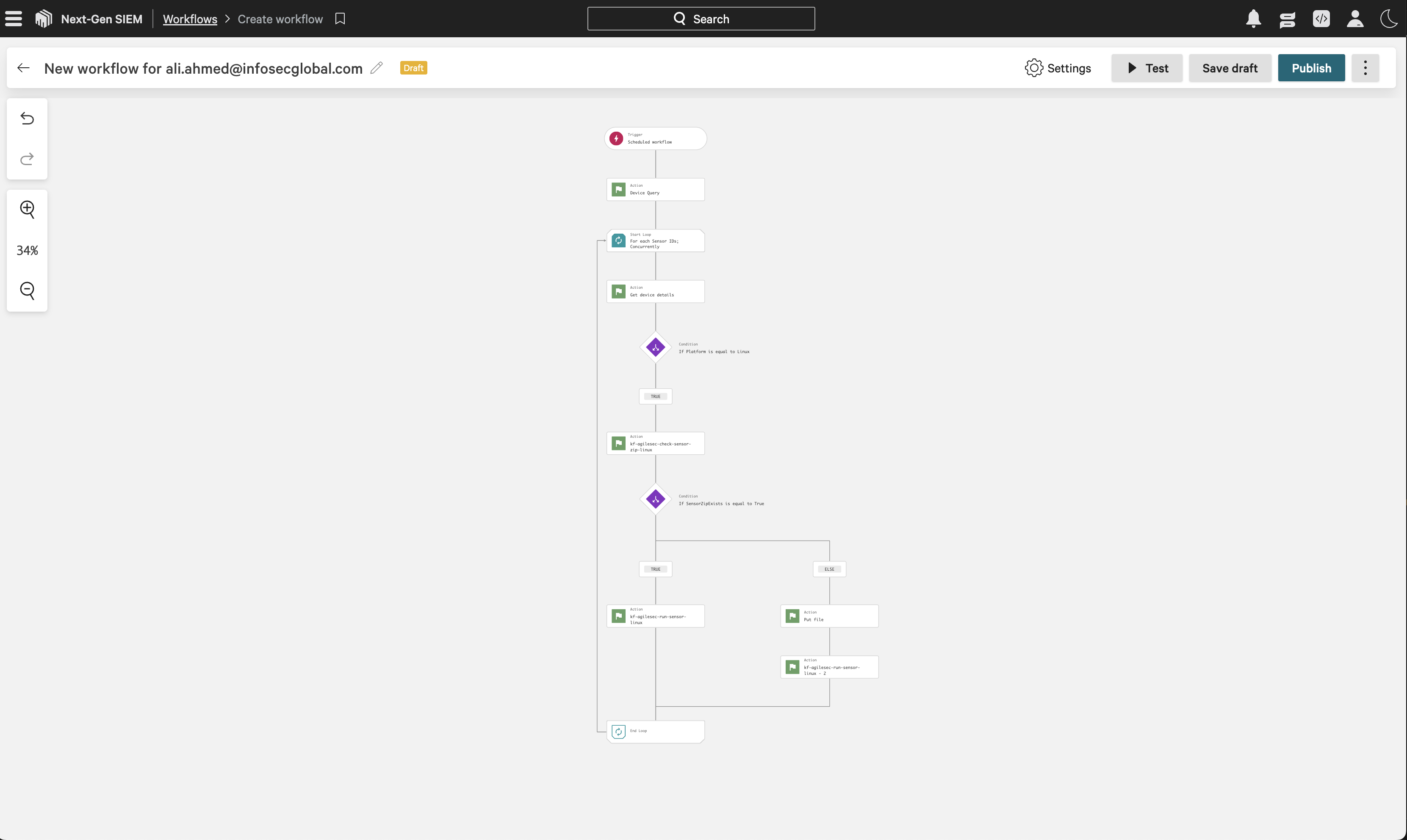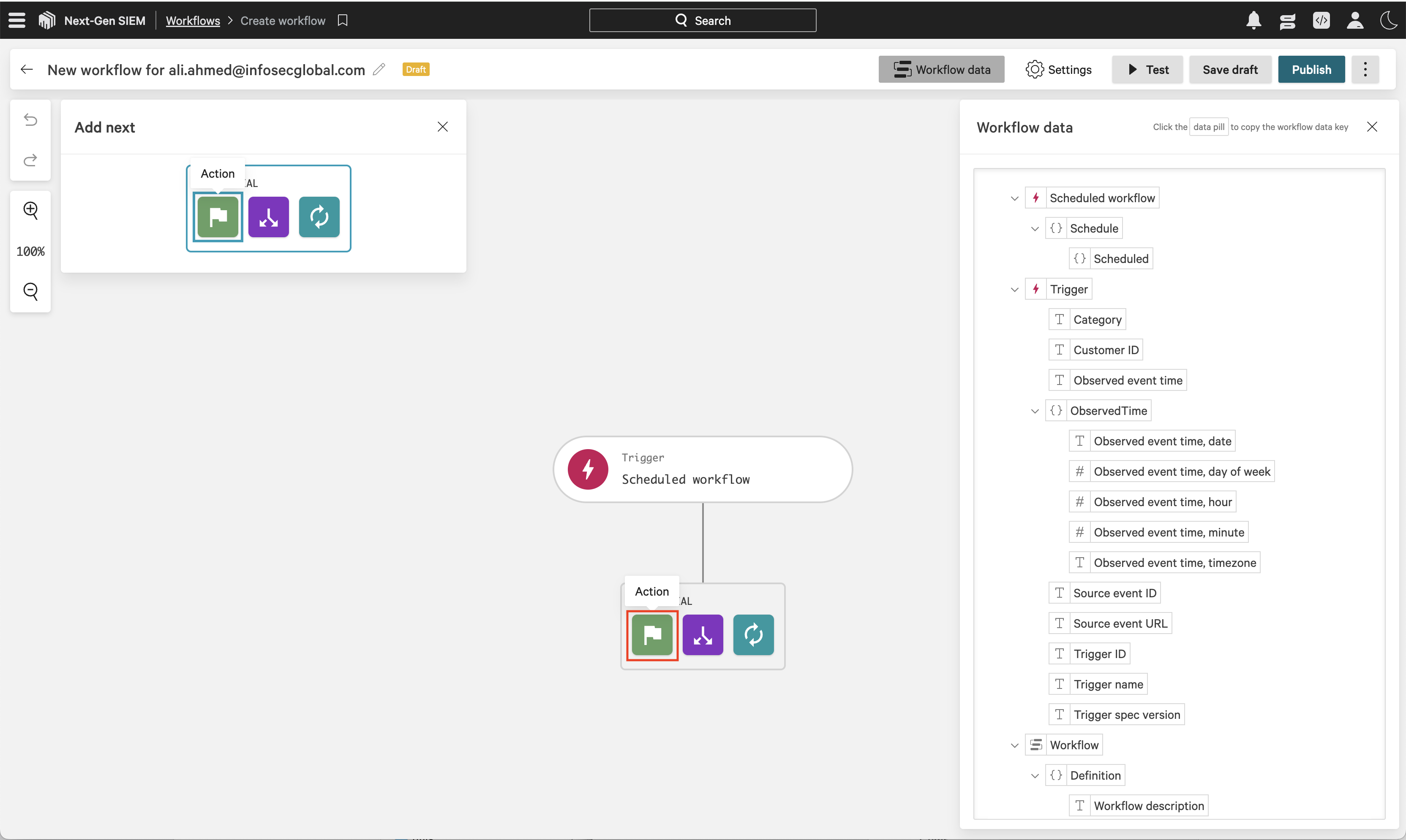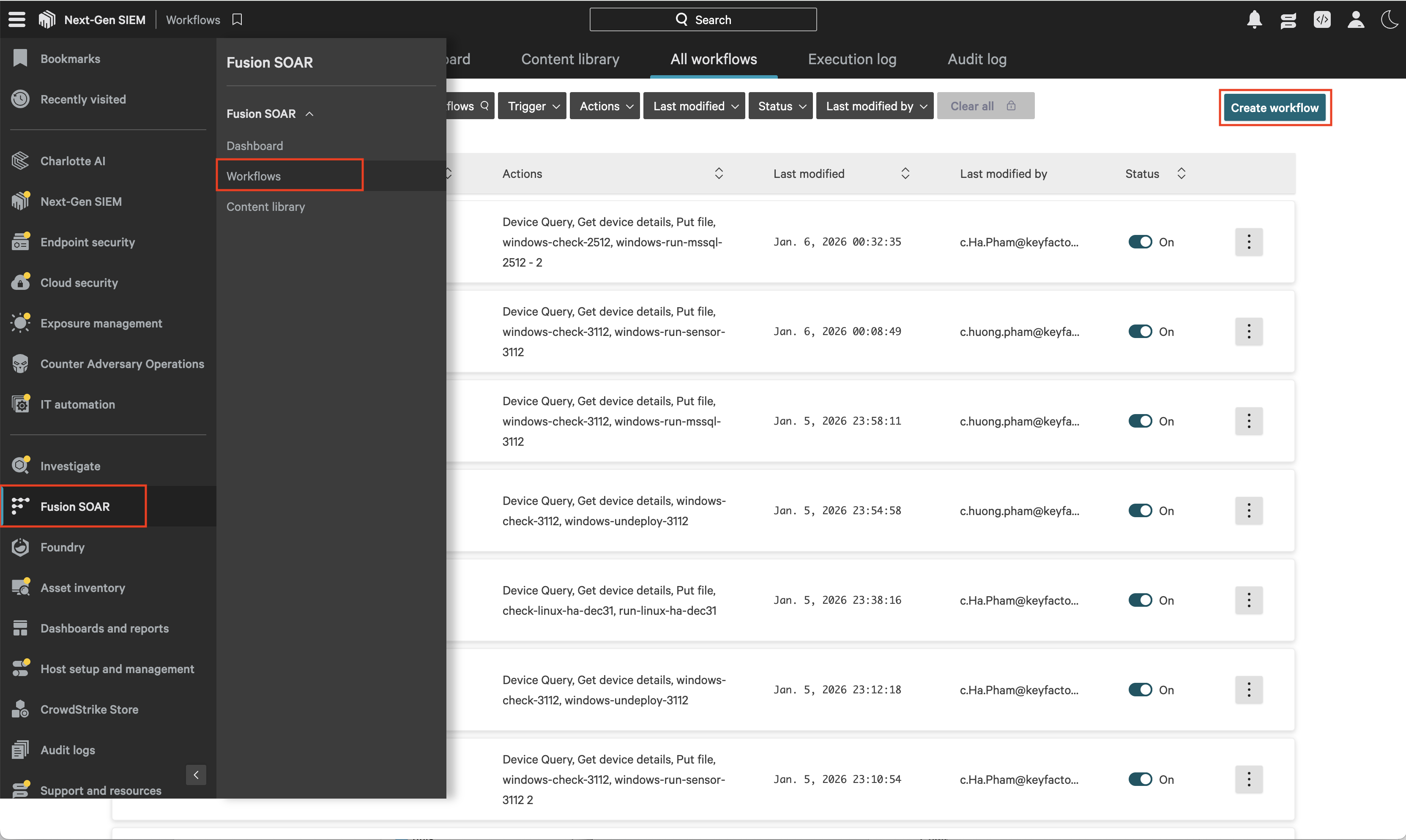 Navigate to Fusion SOAR -> Workflows, then click Create workflow to open then CrowdStrike workflow builder interface.