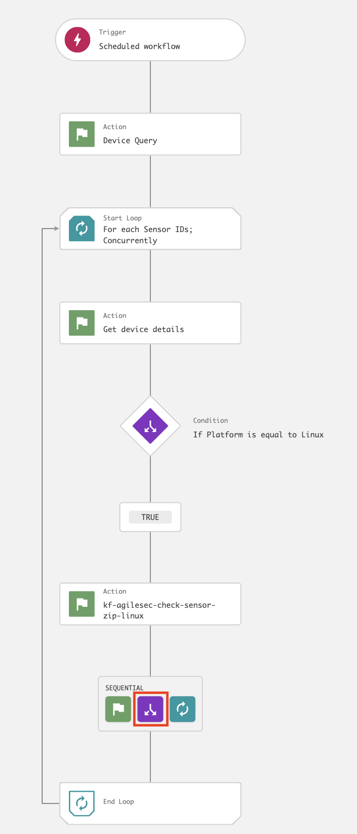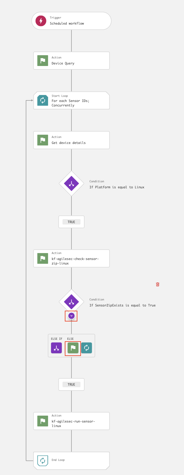 kf-agilesec-run-sensor-<platform>using Step 19The workflow is now complete and should resemble the following: