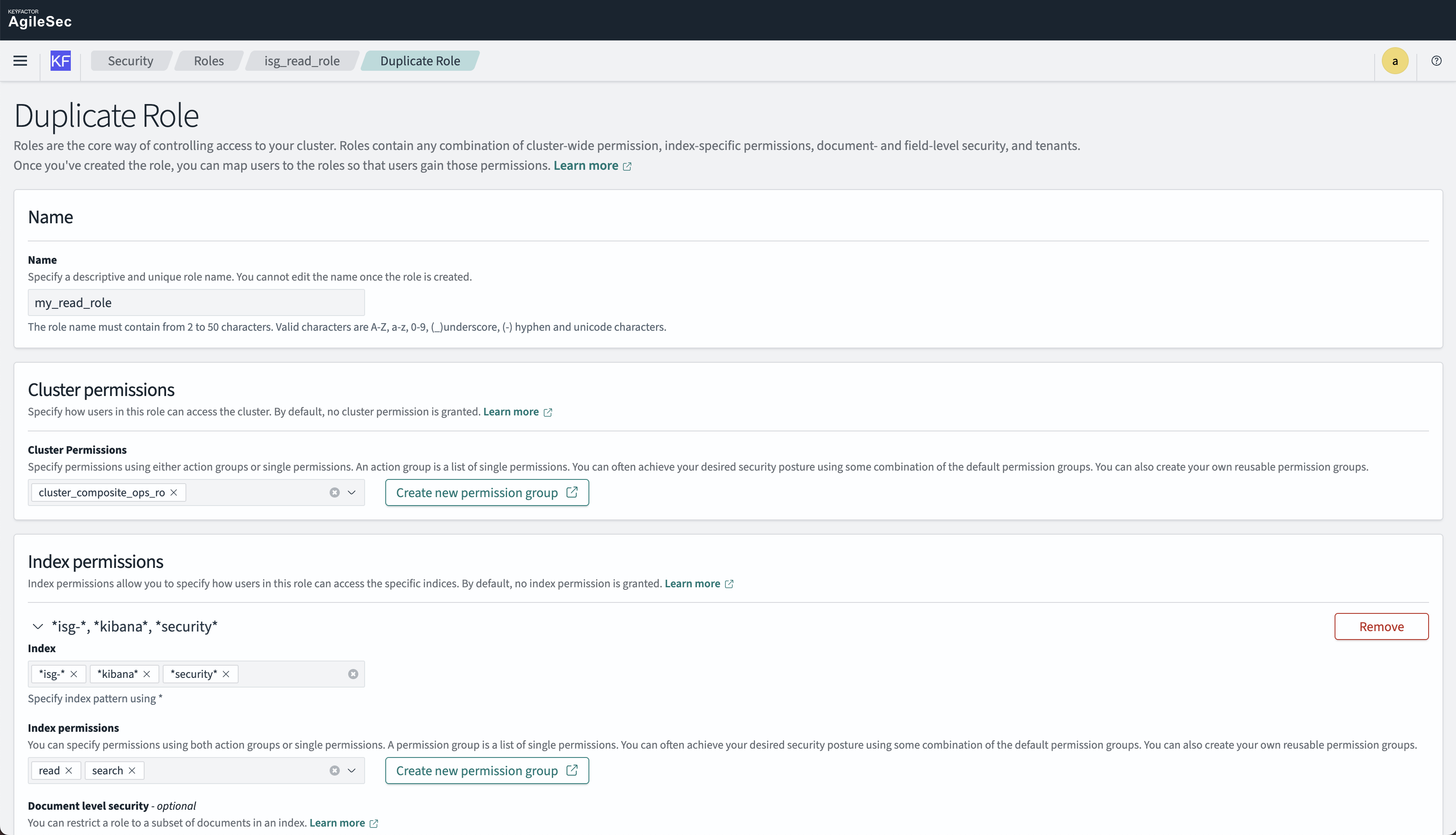 isg-*,*kibana*,*security*(no change)Index permissions: Add