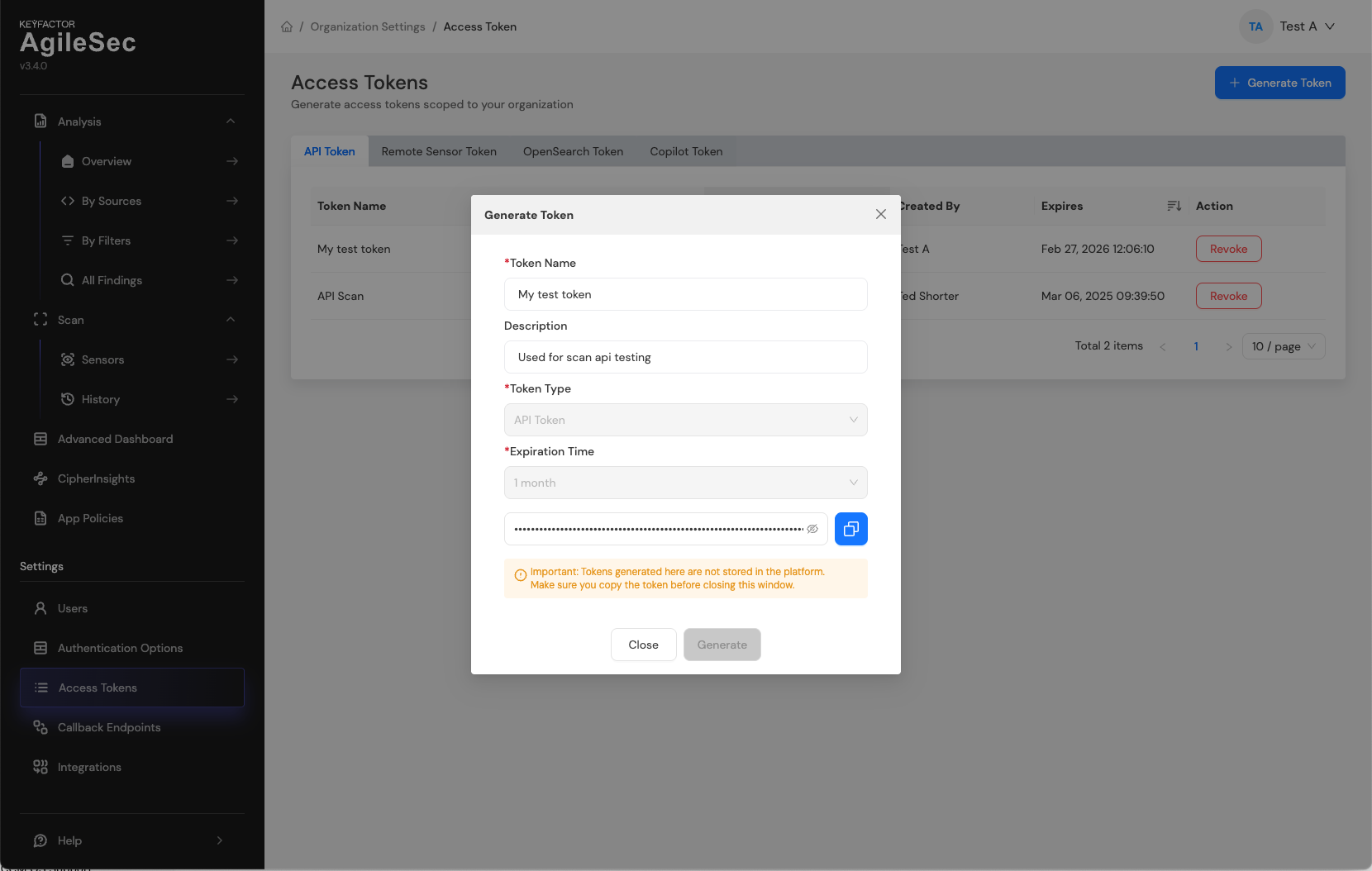 Copy the token immediately and store it in a secure secrets store (for example, a password manager or Vault). The token will not be shown again.