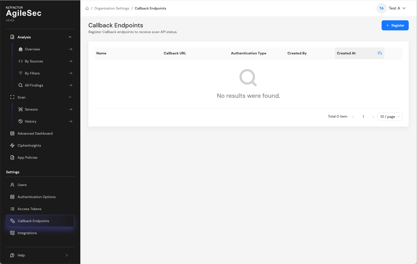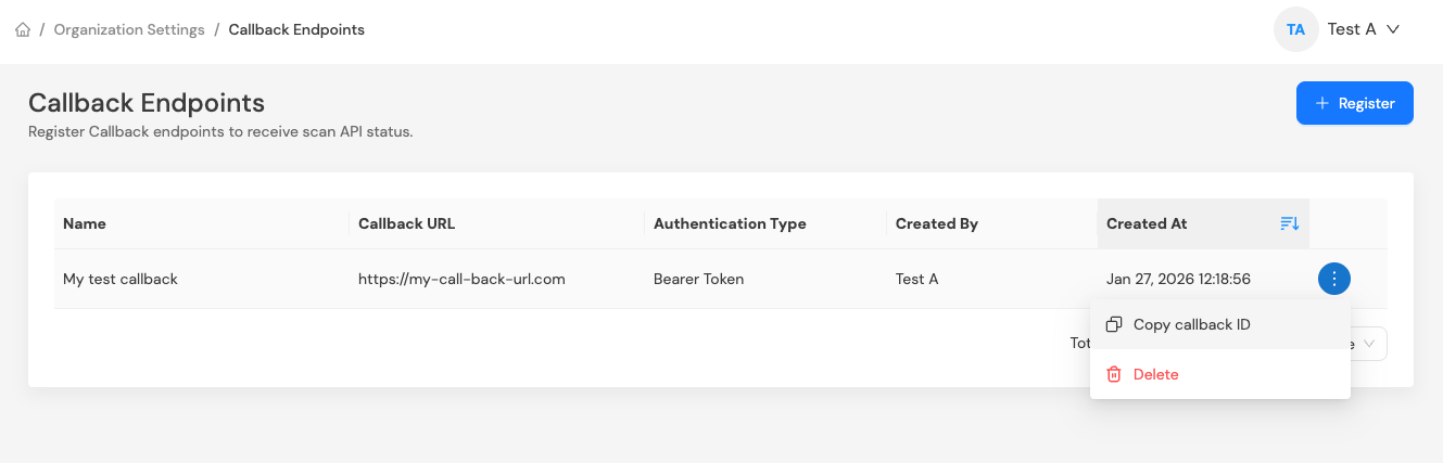 To receive scan status updates for API-initiated scans, you must register one or more callback endpoints. Registering callback endpoints lets you reference a pre-approved endpoint by Callback ID, so you don’t need to send sensitive callback credentials with each scan request.