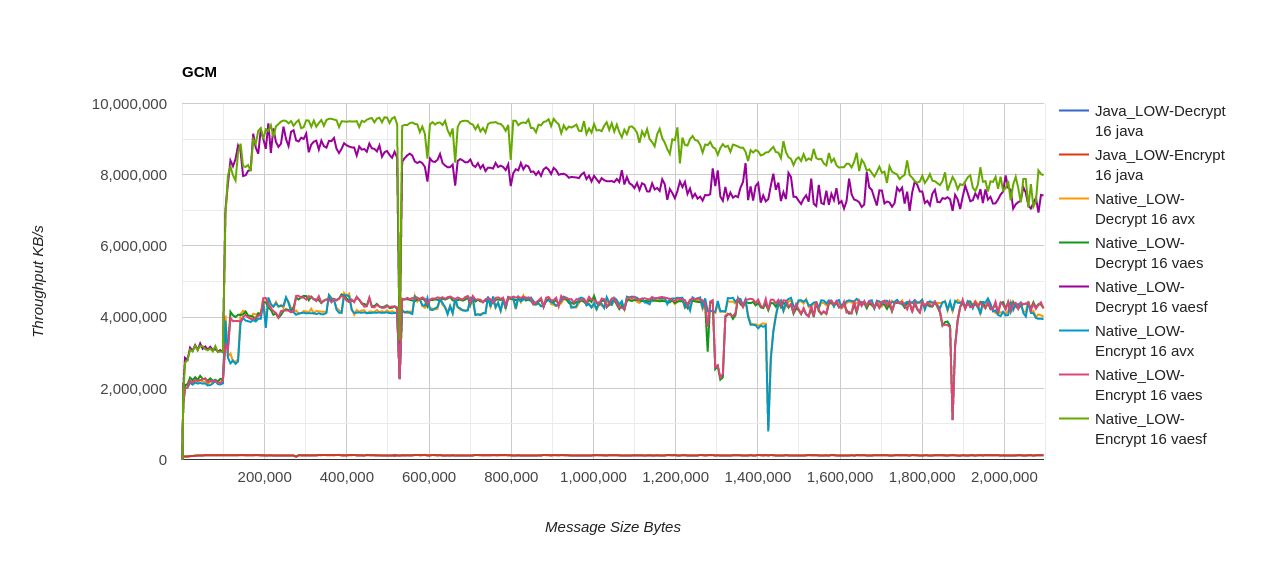The plot shows AES-128 GCM, using 3 different Intel CPU profiles for native processing as well as the pure Java version In case you’re wondering, the sudden drops are due to garbage collection, but the overall change in performance is demonstrated by the fact that the scaling of the graph to fit the numbers has almost squashed the pure Java plot into the X axis.
