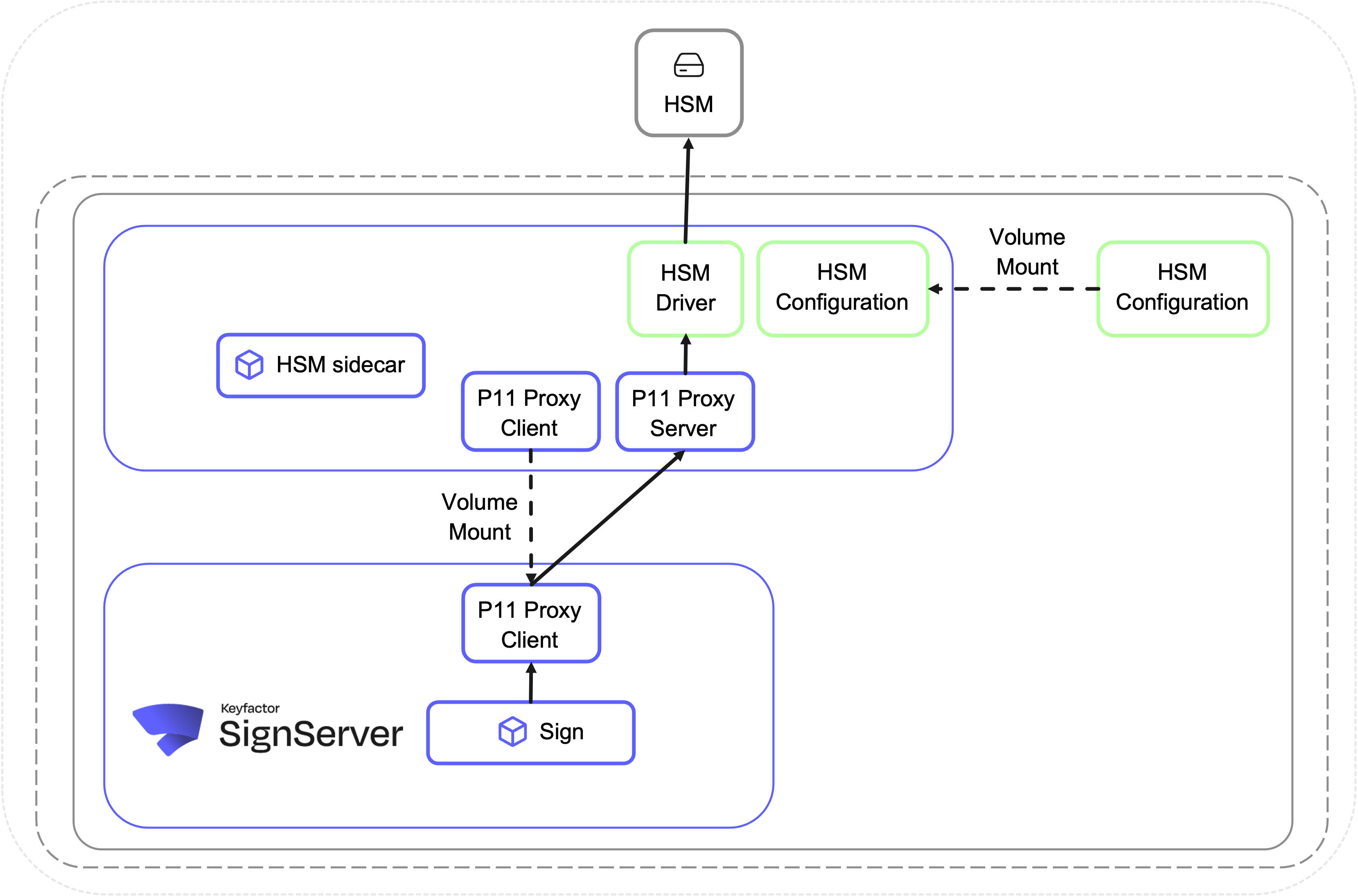 To integrate with HSMs that use the PKCS#11 interface, a separate sidecar container is required. This setup facilitates communication between the EJBCA/SignServer application container and the HSM exposing the PKCS#11 interface.