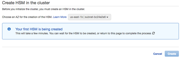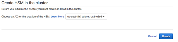 When you create a cluster, you specify an Amazon Virtual Private Cloud (VPC) and a Subnet in the Availability Zone (AZ) of your instance. You then create an HSM in your cluster, selecting an Availability Zone (AZ) for the creation of the HSM.