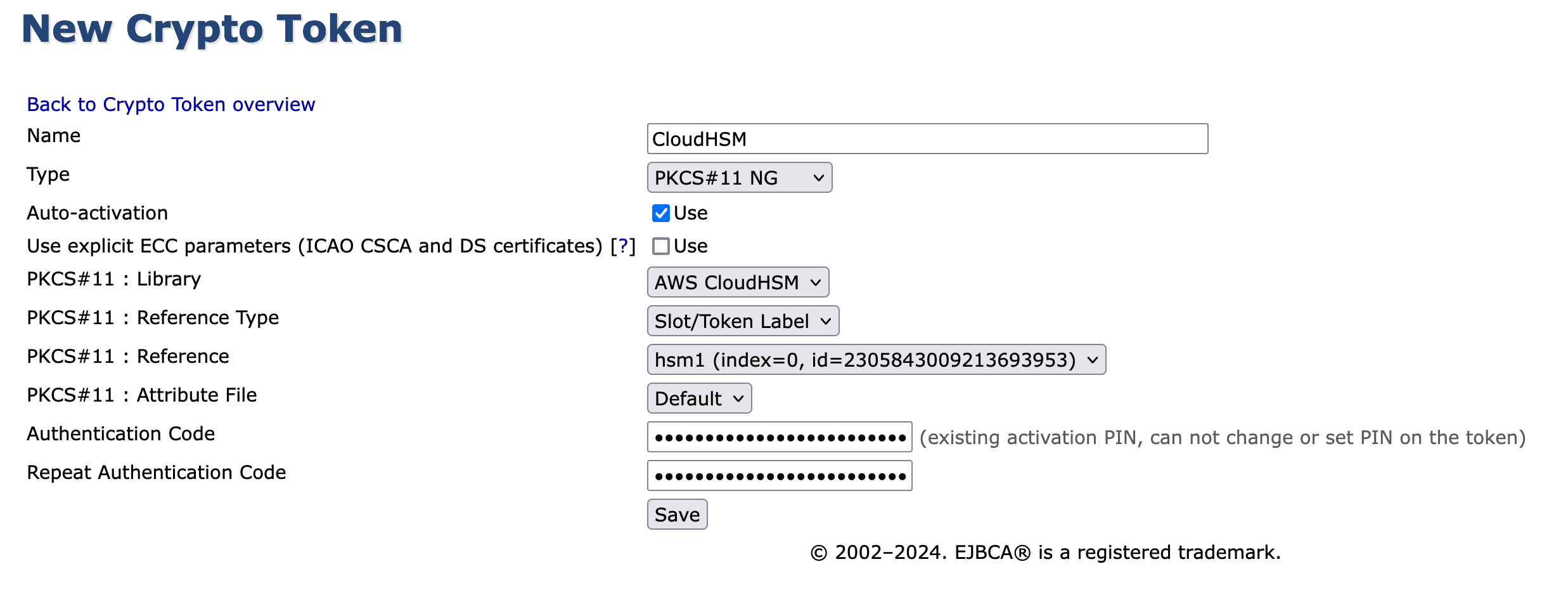 For EJBCA 7.5 and above with SDK5:Name: <anything> (For example "CloudHSM Root Slot")