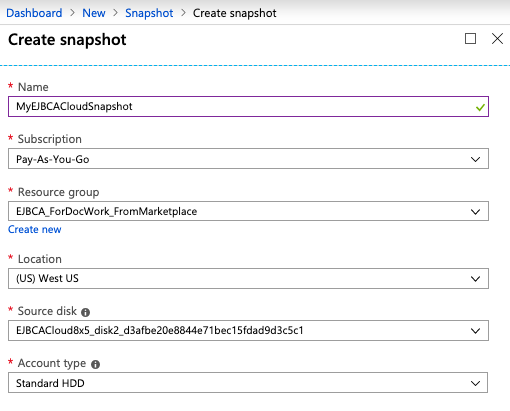 To backup an instance of EJBCA Cloud, you can either use the CLI script included on the instance or create a snapshot in the Azure Portal. This section describes how to backup using an Azure snapshot. For information on how to backup via script, see Backup via CLI Script.