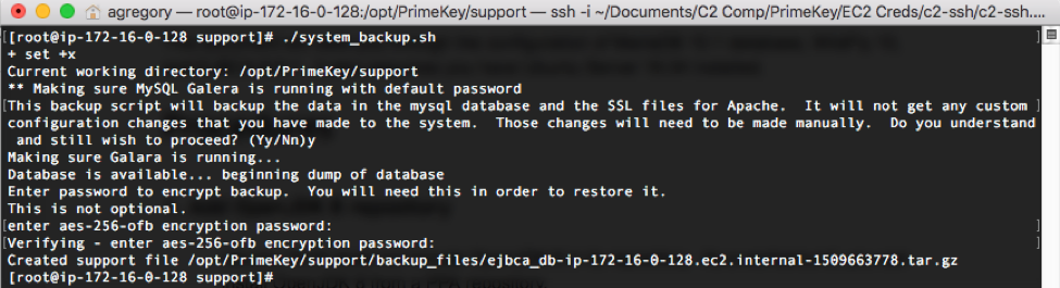is copied to/home/ec2-user/:CODE# cp /opt/PrimeKey/support/backup_files/ejbca_db-ip-172-16-0-128.ec2.internal-1509663778.tar.gz /home/ec2-user/It is recommended to copy this backup to another system, either locally from the administration workstation, or in another AWS data center. For more information on how to copy the file from the EJBCA Cloud instance, see the Copying Backup Files to Other Systems section.