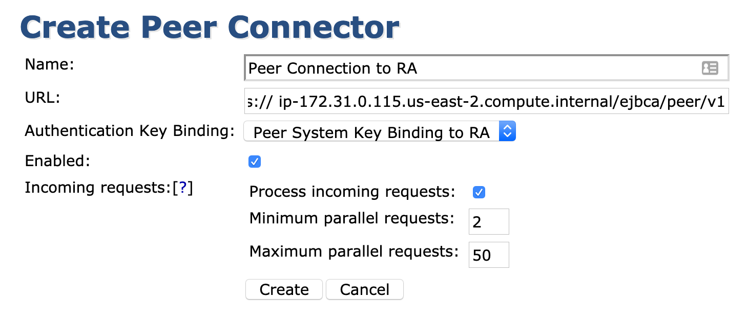 - URL: This should be the internal FQDN of the RA. For this example: "https:// ip-172.31.0.115.us-east-2.compute.internal/ejbca/peer/v1"