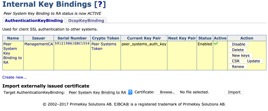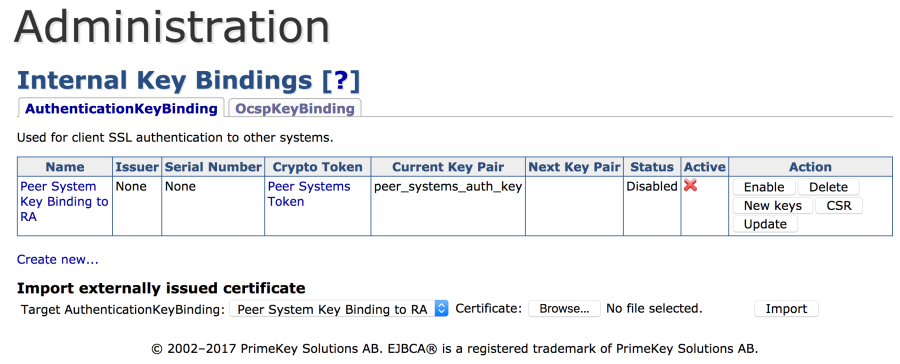 EJBCA Enterprise Cloud Uses Apache and no port designation is necessary. - In the Authentication Key Binding list menu, select Peer System Key Binding to RA