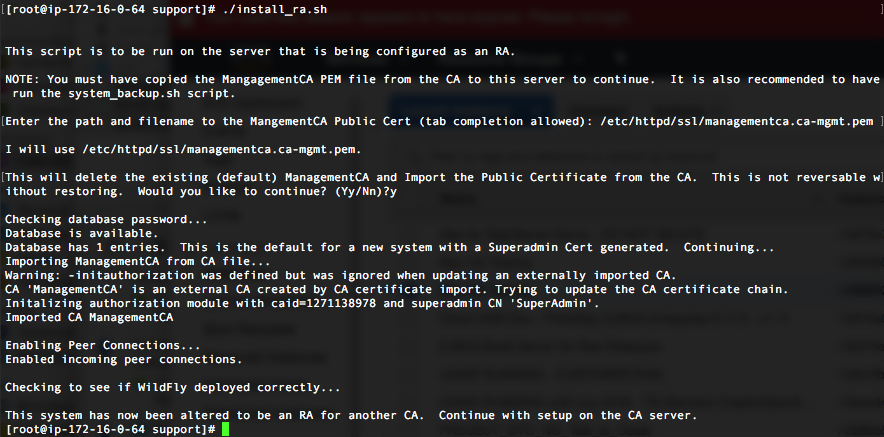 Convert the server to an RA using the install_ra.sh script. This script will import the ManagementCA certificate from the CA server so that the RA is managed by the same ManagementCA as the CA server.