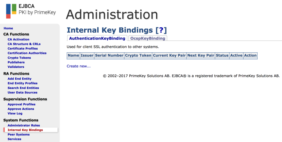 - Click Create new on the AuthenticationKeyBinding tab.