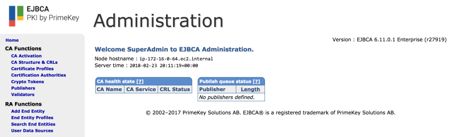 Access the RA Administration GUI with the same certificate used to access the CA server. Test this by going to the EJBCA Admin Web on the RA. Note that there is no Management CA configured, an external ManagementCA is used.