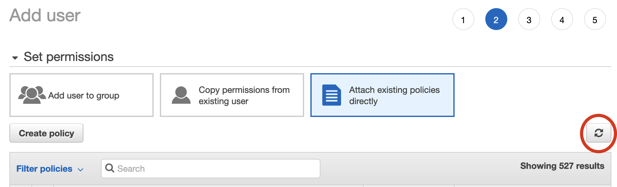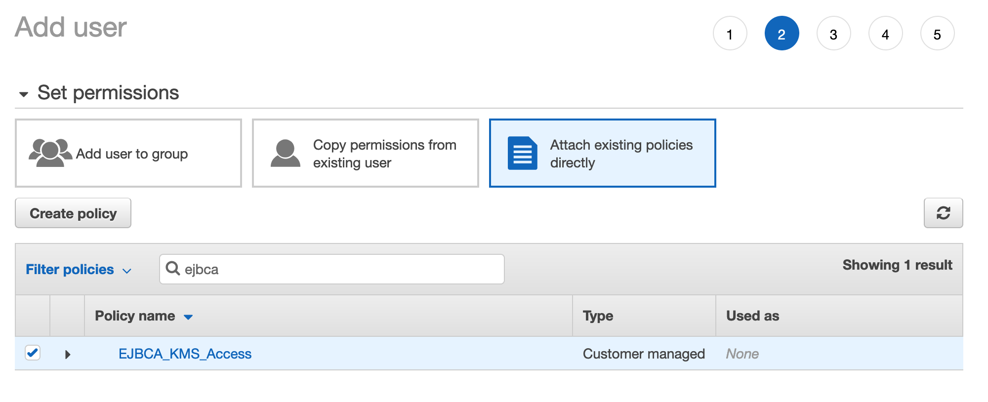 - Select Attach existing policies directly under Set permissions and then click Create policy.
