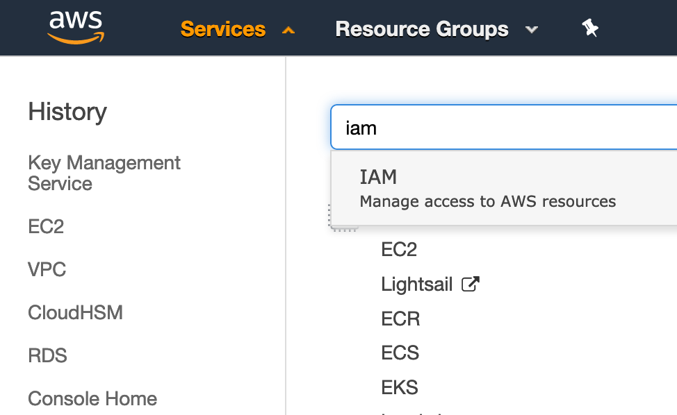 - Sign in to the AWS console, select the Services drop-down and search for "IAM".