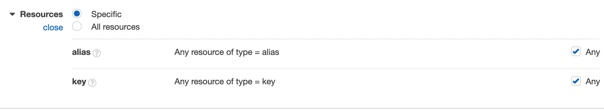 - Under Resources, select Any for both alias and key resources.