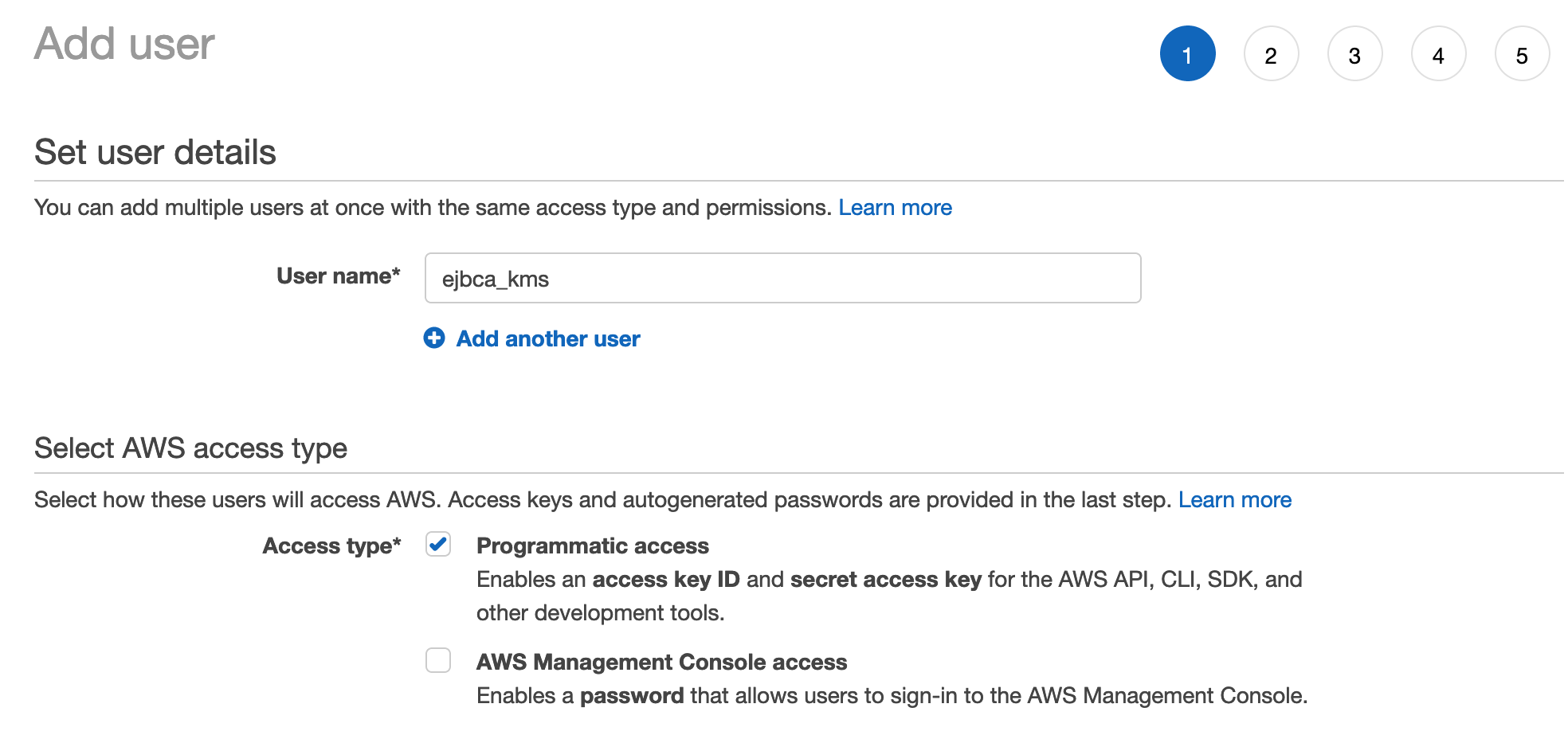 - Select Programatic access to allow the user to access the KMS API, but not log into the AWS console.