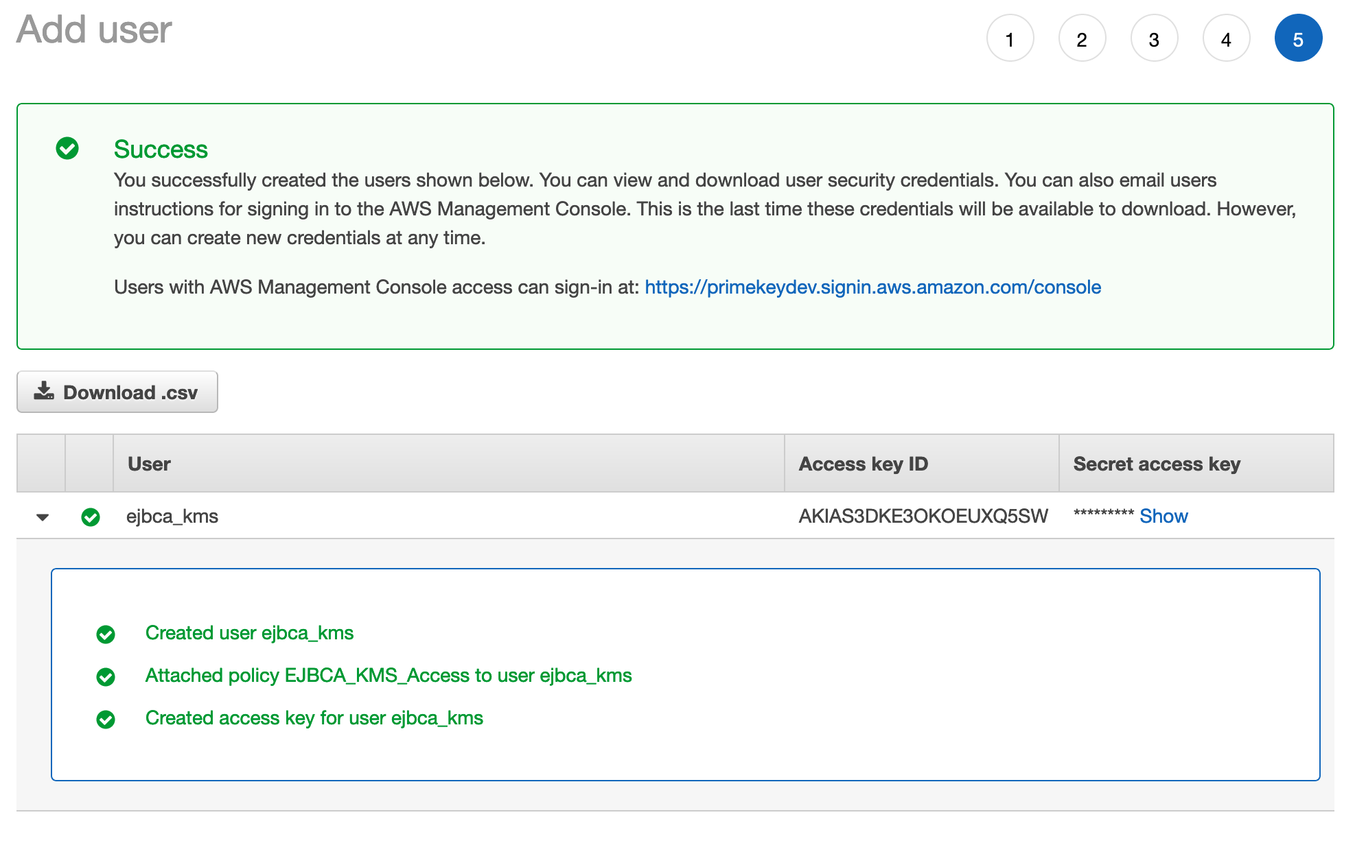 - Click Next to add tags if desired through step 5 to Create user. A successful creation message displays the Access key ID and the Shared access key. Note these credentials down or download the .csv file with the credentials since the Access key ID and the Shared access key will later be used in the EJBCA Crypto Token to access the KMS.