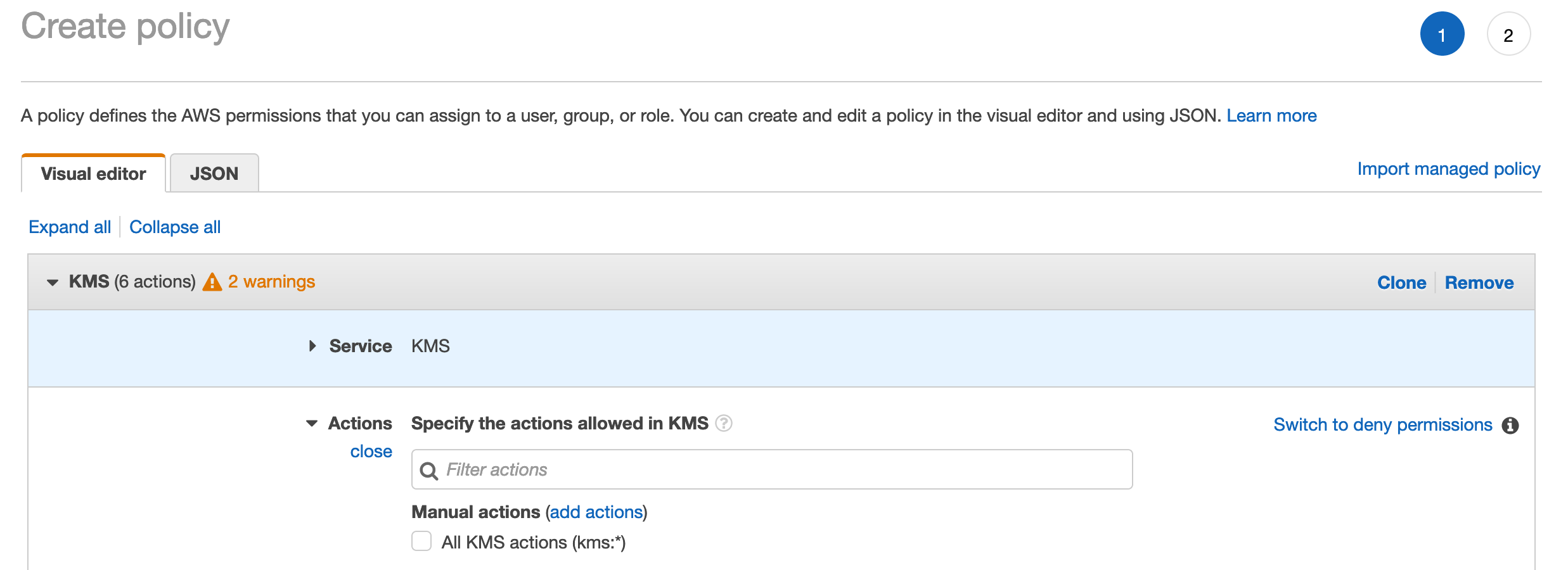 - In the opened browser tab Create policy, search for KMS in the product search field and select KMS.