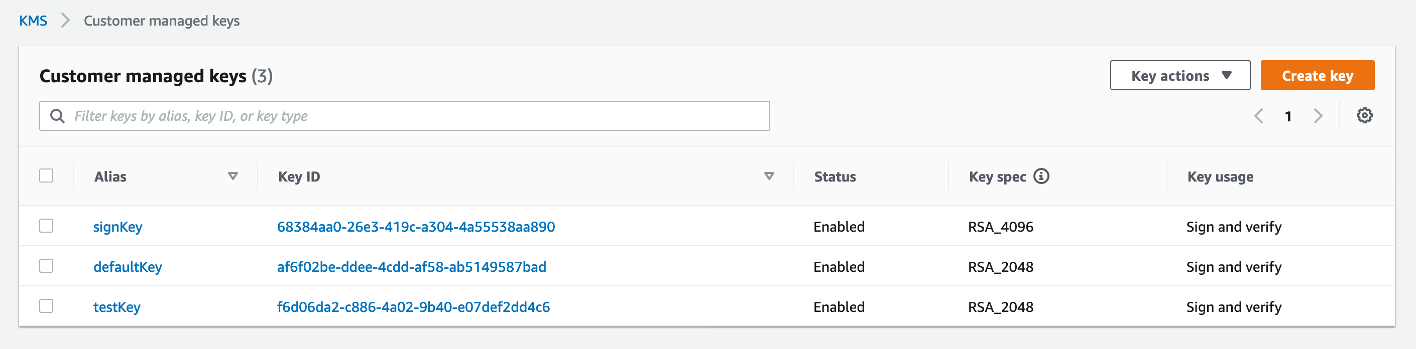 - Go to the KMS console and confirm that the keys created in EJBCA are listed.