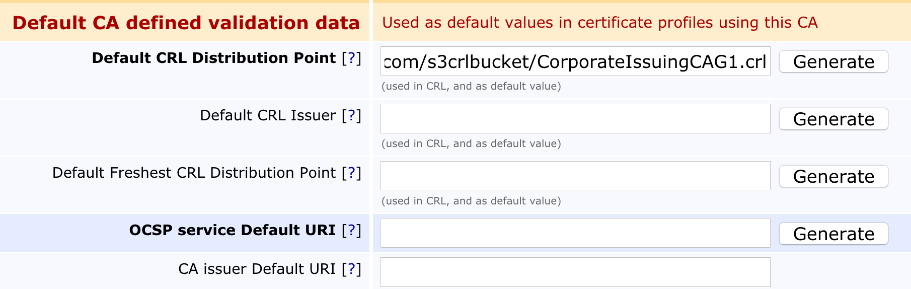 - Get the URL for the CRL generated in the previous section. If using a CName in DNS, enter this custom URL, in this example http://s3.amazonaws.com/s3crlbucket/CorporateIssuingCAG1.crl.