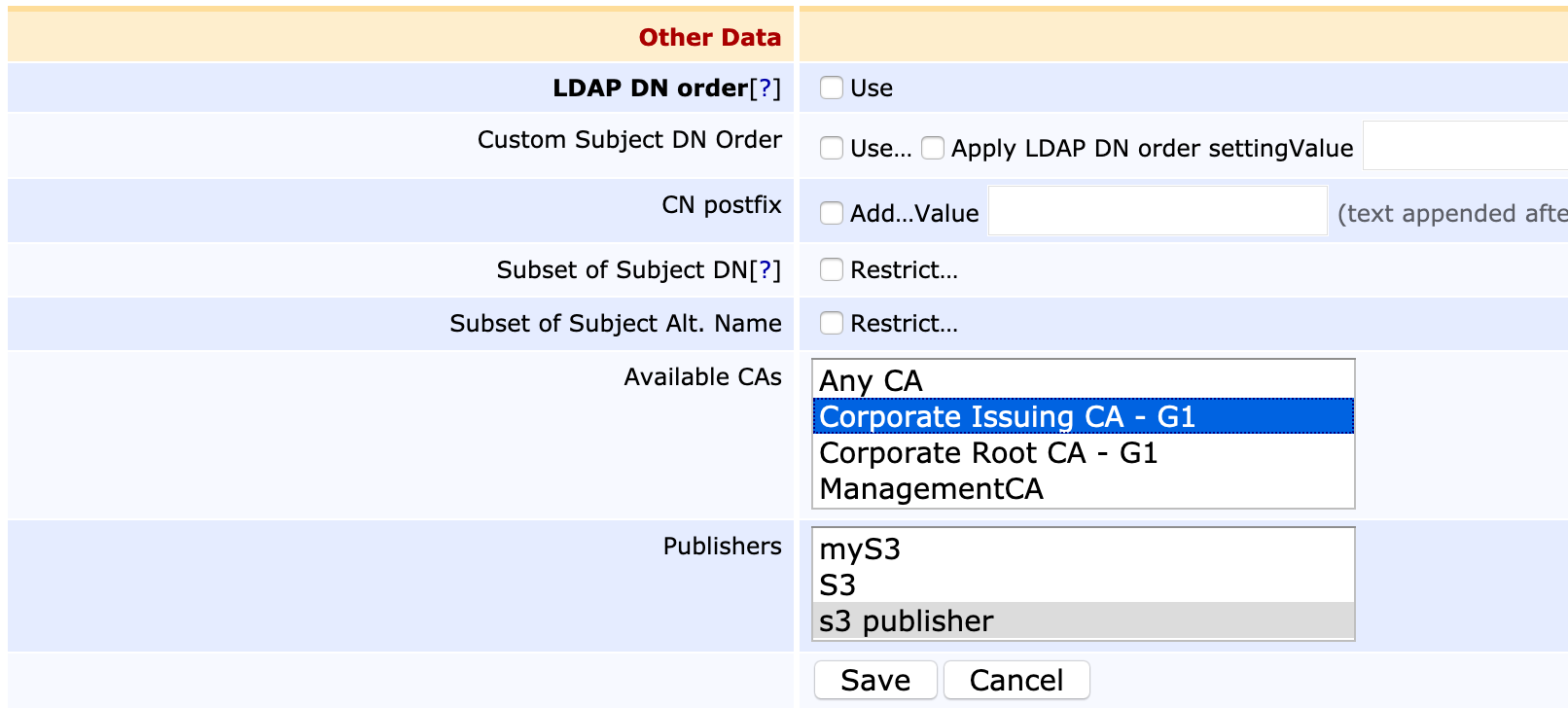 - Under Other Data, in the Publishers field, select the AWS S3 Publisher created in the previous step Configure Custom S3 Publisher, in this example s3 publisher.