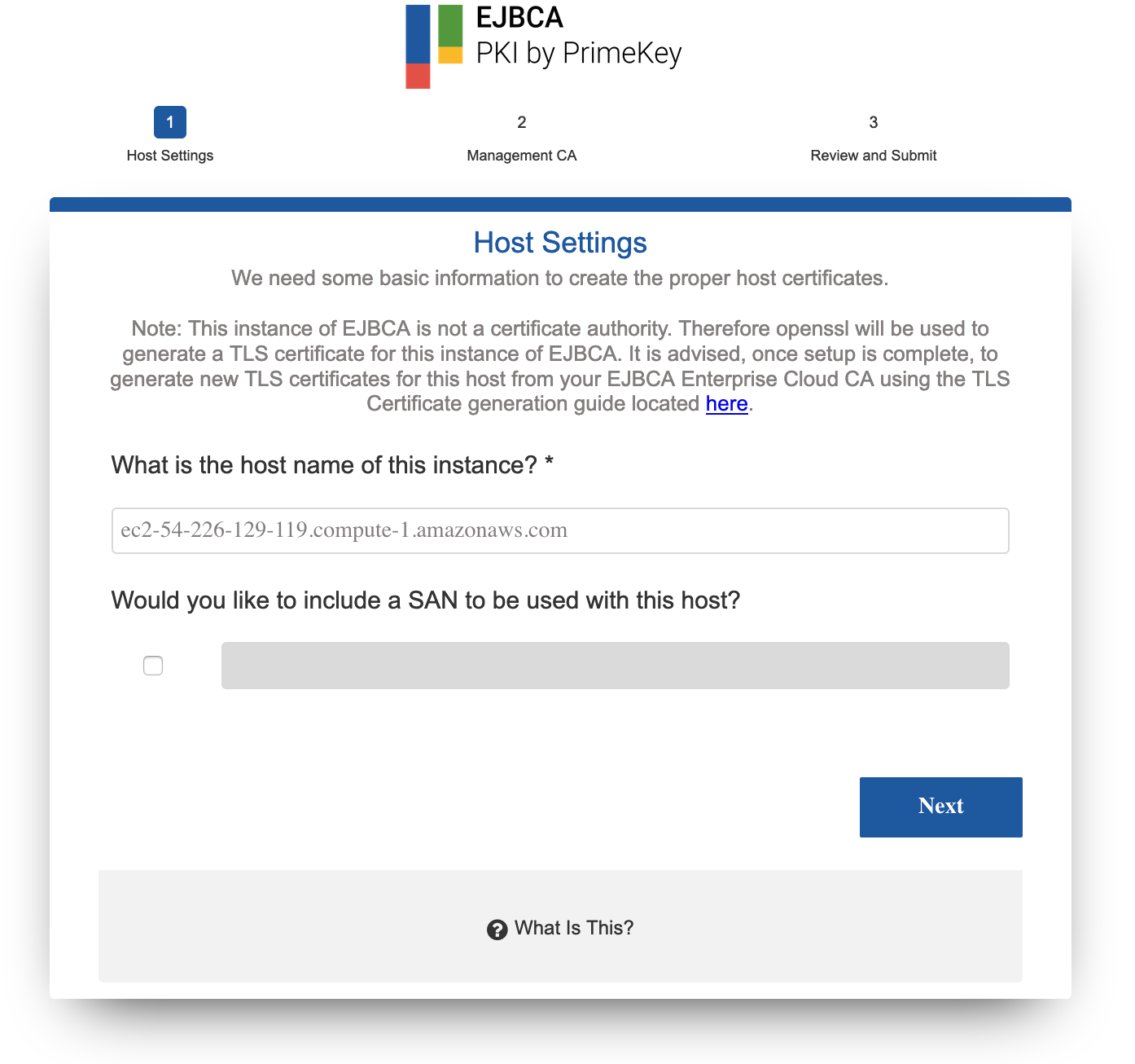 - Using a Subject Alternative Name (SAN) with this host can be done so that a public URL can be used to access EJBCA. For example, if you would like to use https://pki.company.com/ to access a cluster of hosts, you can enter that DNS name into the wizard to be added as a SAN in the instance's TLS certificate. To use this feature, select the option specify a valid domain name. Note that the wizard will not verify that the domain name is a valid domain, but will confirm that the syntax is a recognized domain format.