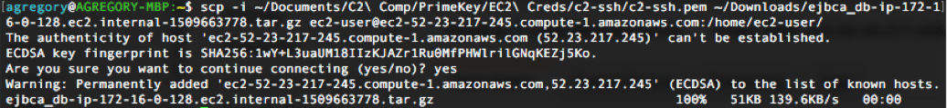 # scp -i ~/Documents/C2\ Comp/PrimeKey/EC2\ Creds/c2-ssh/c2-ssh.pem ~/Downloads/ejbca_db-ip-172-16-0-128.ec2.internal-1509663778.tar.gz ec2-user@ec2-52-23-217-245.compute-1.amazonaws.com:/home/ec2-user/