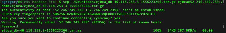 CODE# scp ~/Downloads/ejbca_db-40.118.253.3-1556223266.tar.gz ejbca@52.246.249.239:/home/ejbca/ejbca_db-40.118.253.3-1556223266.tar.gz