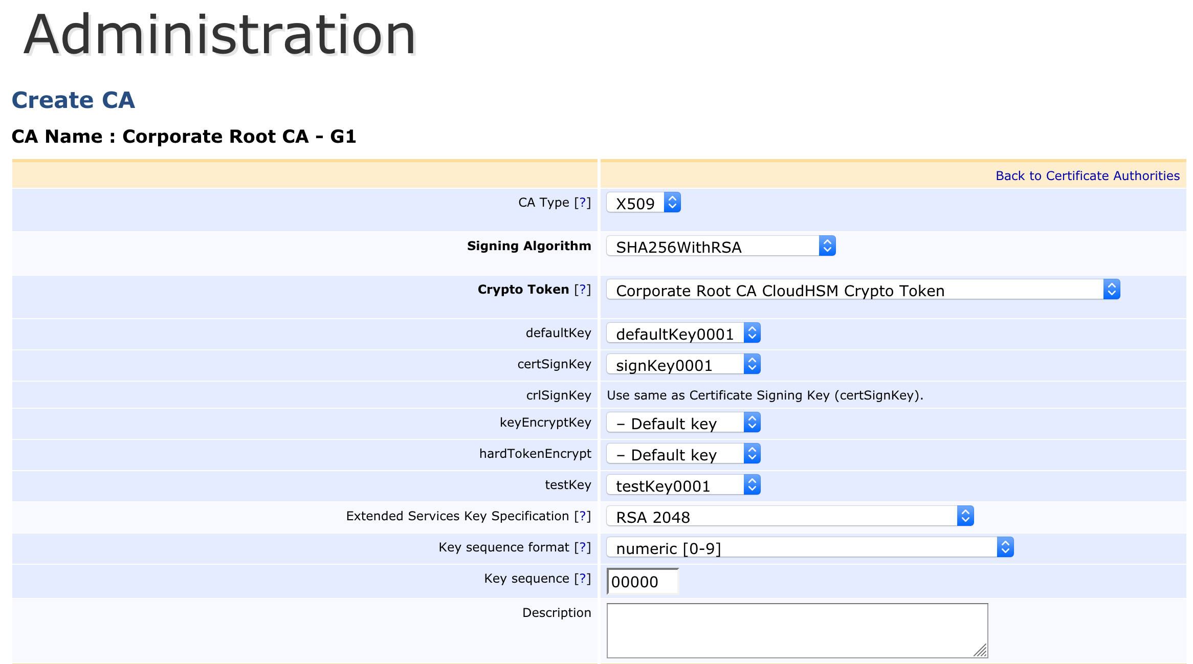 - Under Crypto Token select the Corporate Root CA CloudHSM Crypto Token Crypto Token. If you named the keys correctly, they should all populate automatically for the proper usages.