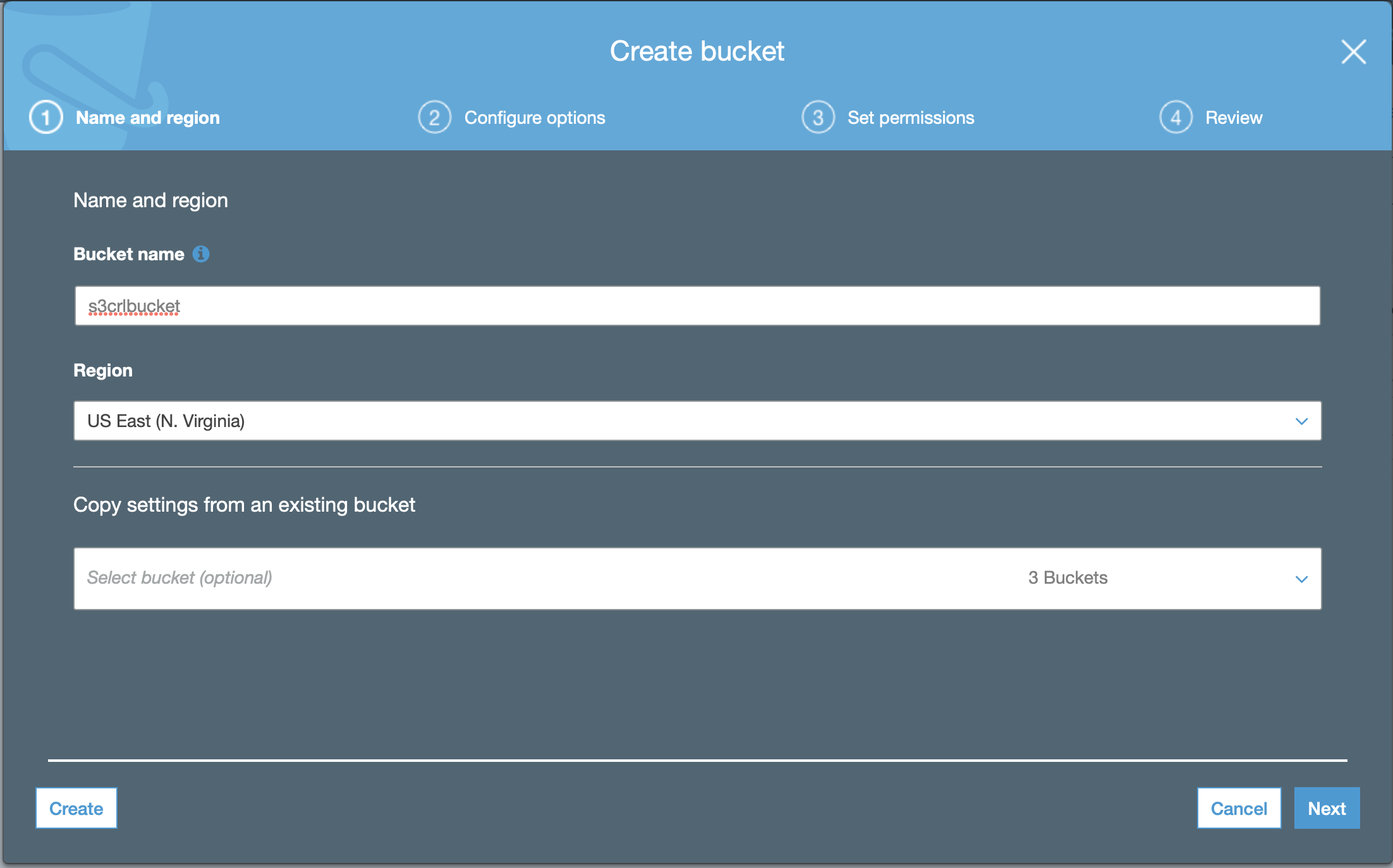 - Enter a name for the S3 bucket in the Bucket Name field.