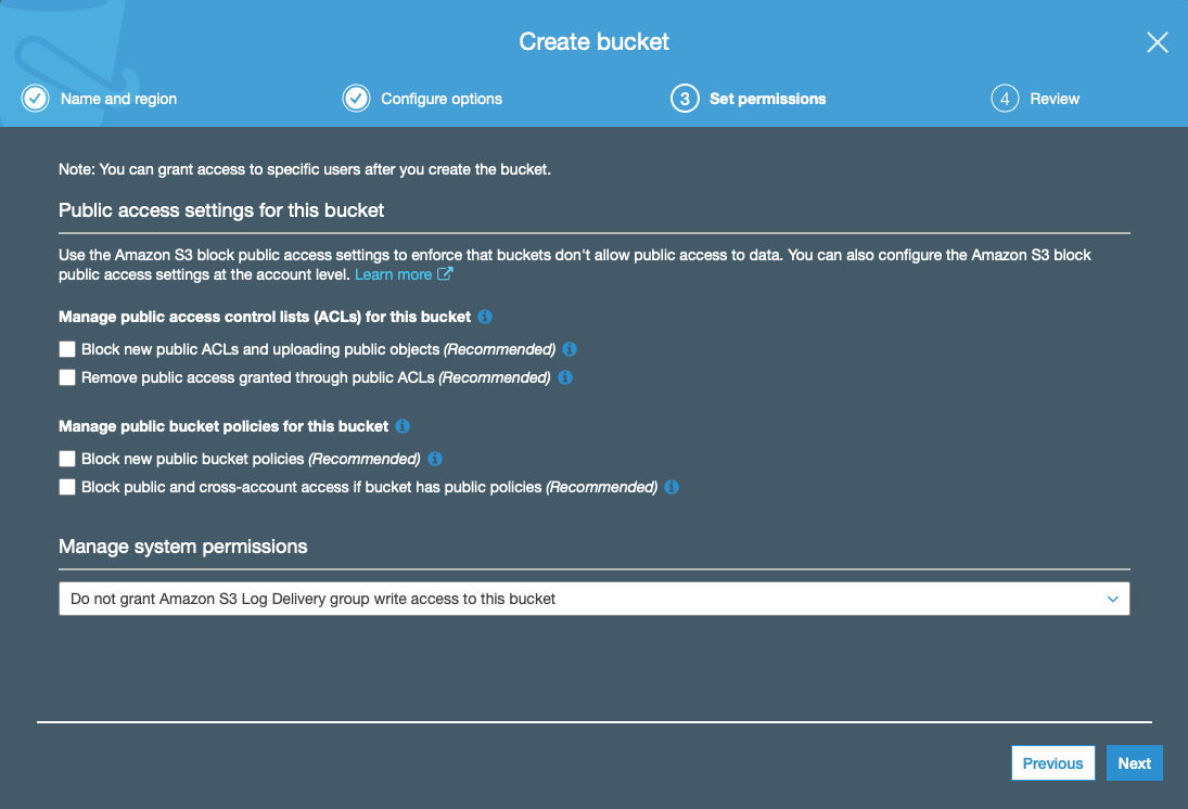 - Click Next and set permissions. CRLs need to be available publicly and do not contain sensitive information. To make them public, clear the Manage public access control lists (ACLs) for this bucket restriction options.