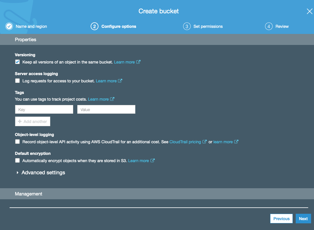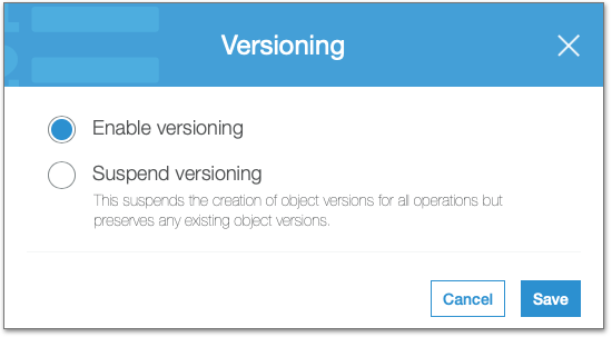 - Select Enable Versioning to keep all files in this bucket as new ones are uploaded, and then click Save.