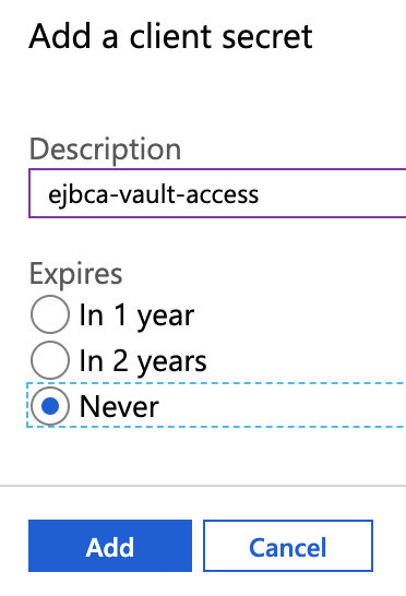 - Enter a name for the secret, such as "ejbca-vault-access". Set the expiration if desired. In this example, the expiration is set to Never expire to allow the CA to always have access to the keys in the HSM. Click Add once done.