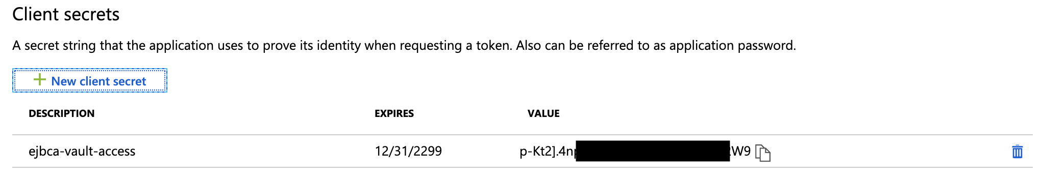 - A secret is generated and displayed. Note this secret down in a password manager such as Last Pass as it will only be displayed once in the portal. The secret will also be required in EJBCA when creating a Crypto Token in the later step Creating an Azure Key Vault Crypto Token in EJBCA.