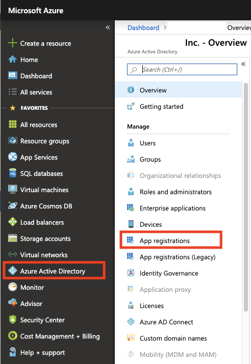 - Select the Azure Active Directory service in the left-hand navigation pane, and then select App registrations > New registration.