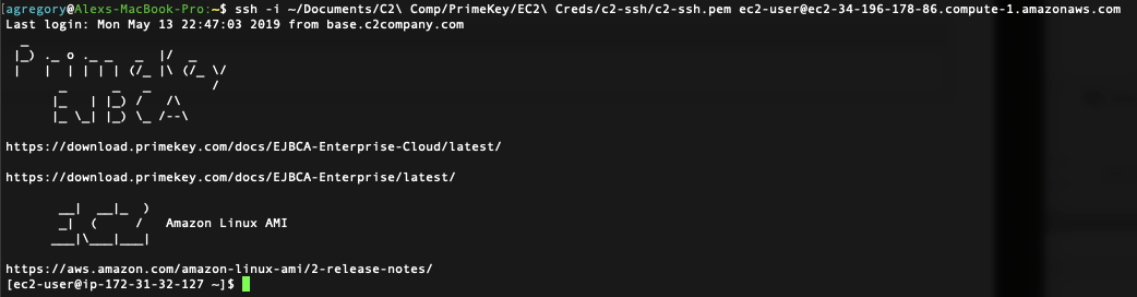 Using the SSH key that you selected when procuring the instance, SSH into the EJBCA Enterprise Cloud instance using the username ec2-user: