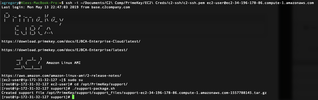 - Copy this file to the /home/ec2-user/directory so it can be copied off easily with SCP. In this case the file was named "support-ec2-34-196-178-86.compute-1.amazonaws.com-1557788145.tar.gz"CODE
