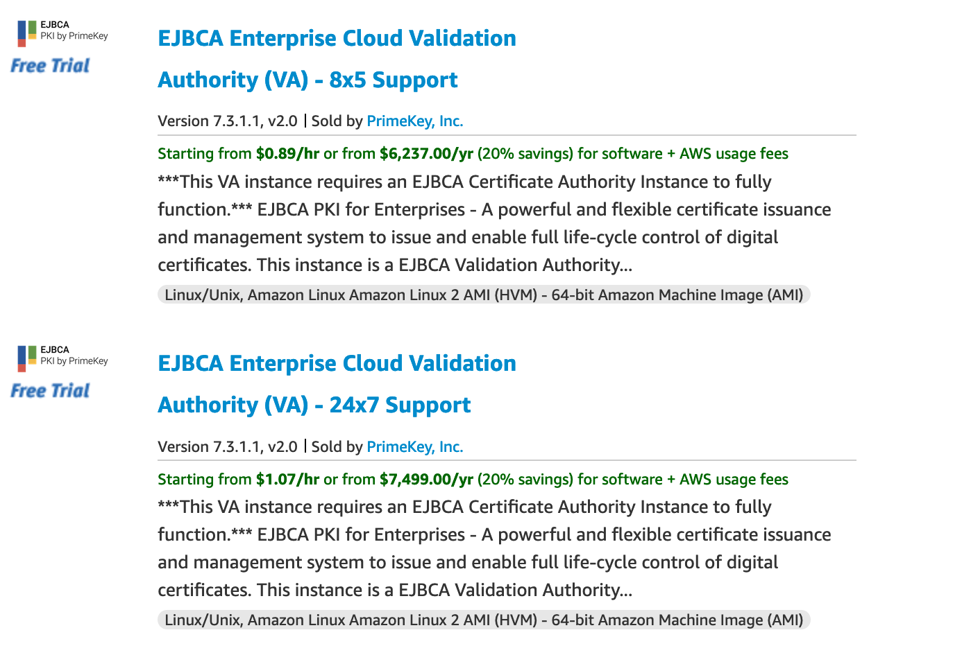 Browse to the AWS Marketplace and search for "primekey" to display the following two results: one for EJBCA Enterprise Cloud Validation Authority (VA) - 8x5 Support and the other for EJBCA Enterprise Cloud Validation Authority (VA) - 24x7 Support.