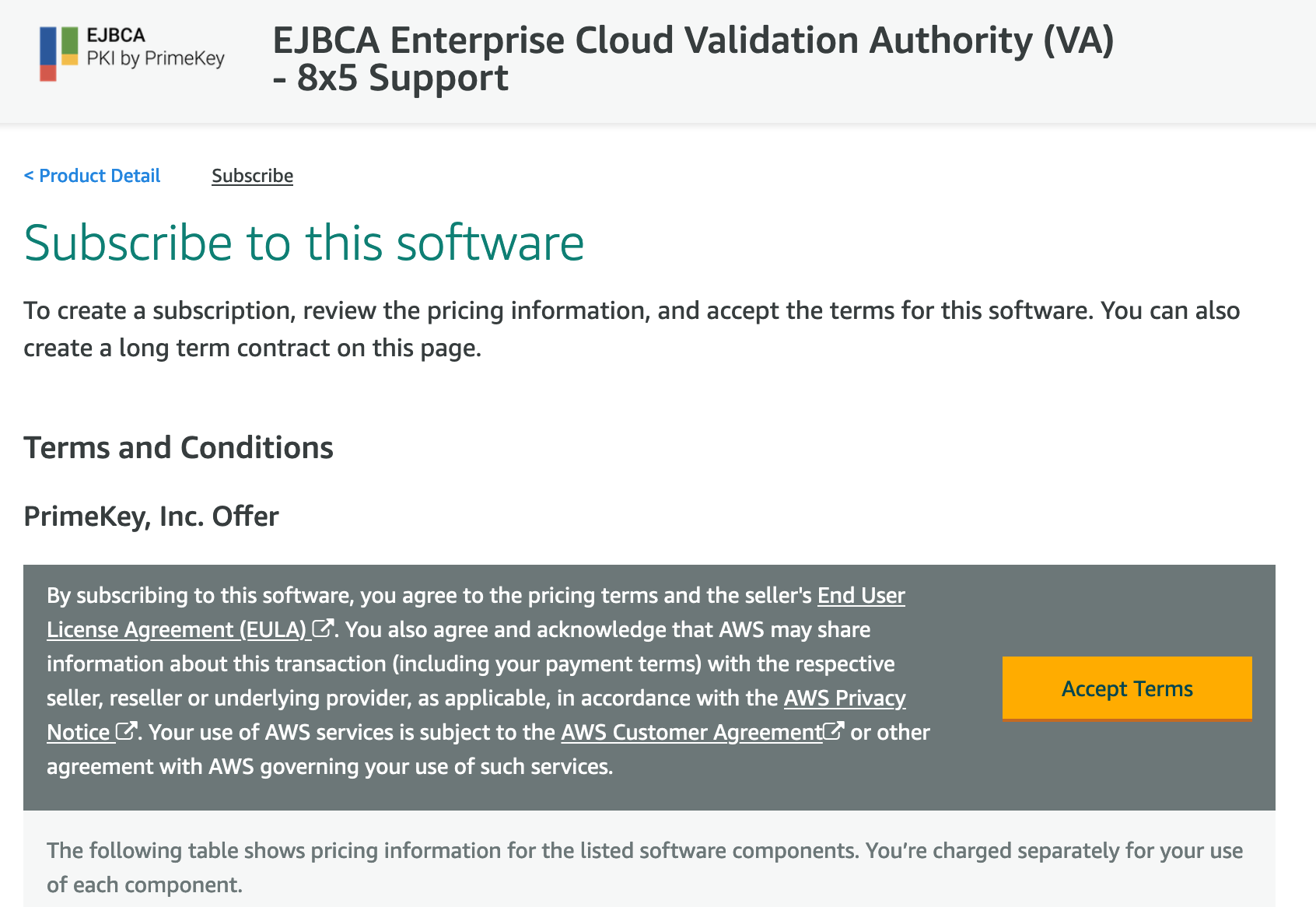 - Review the listing information as desired, select Continue to Subscribe and then, once ready, click Accept Terms.